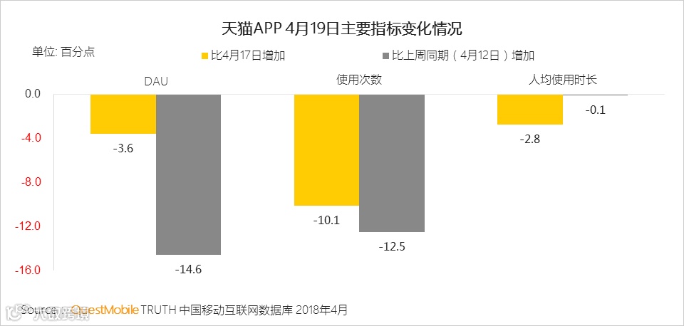 QuestMobile数据显示,在4月19日,即唯品会全球好货节举办当日,天猫APP DAU、用户使用次数、使用时长都有下降,可能受到唯品会的分流影响。