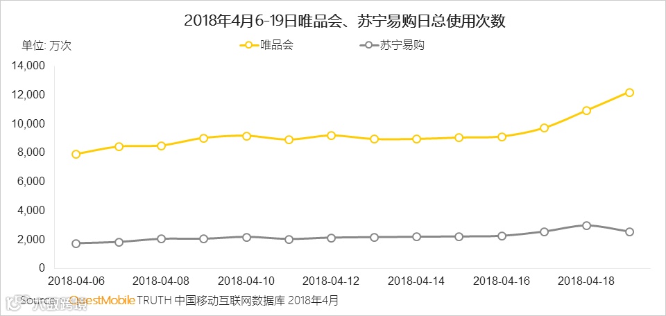 其中,苏宁易购在促销前一周(4.6-4.12日)日使用次数在2000万次左右,而在促销当日接近3000万次。 唯品会在4月18日使用次数便突破1亿次,在4月19日更是突破1.2亿次。
