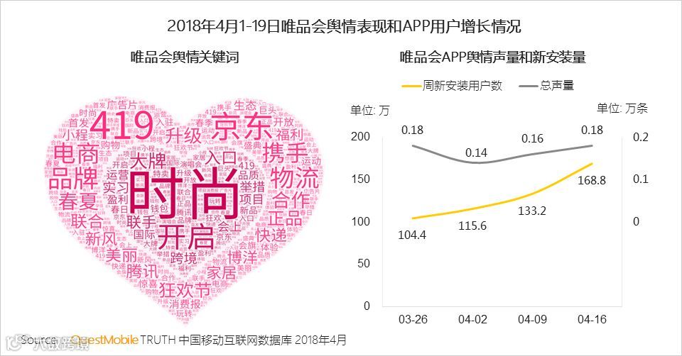 QuestMobile数据显示,唯品会在4月1-19日的舆情多与促销相关,其次是与京东合作相关。在促销活动开启前,APP新安装量增加明显。