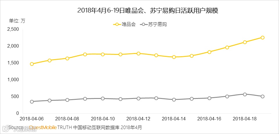 苏宁、唯品会日活跃用户规模增长迅猛