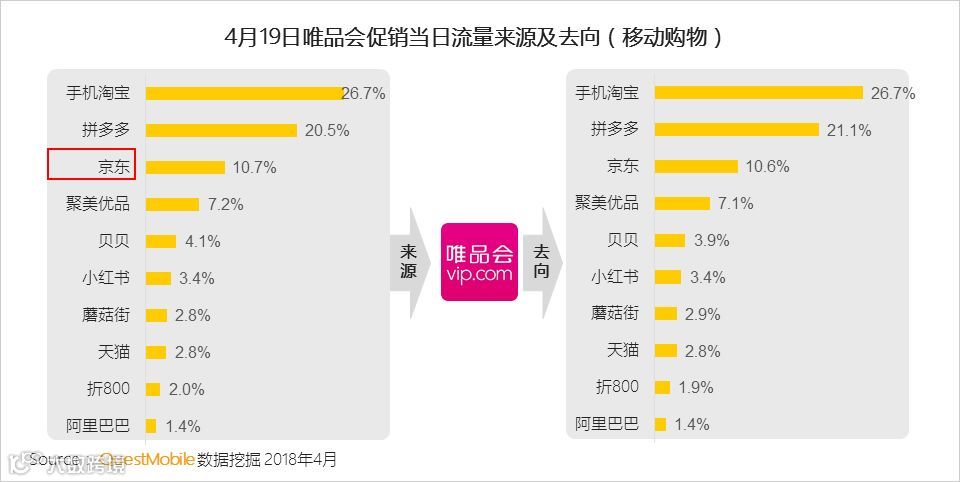 京东2018年3月在首页加入了唯品会入口,对唯品会的导流效果明显。 QuestMobile数据显示,在唯品会的移动购物流量来源APP中,京东高居第3。