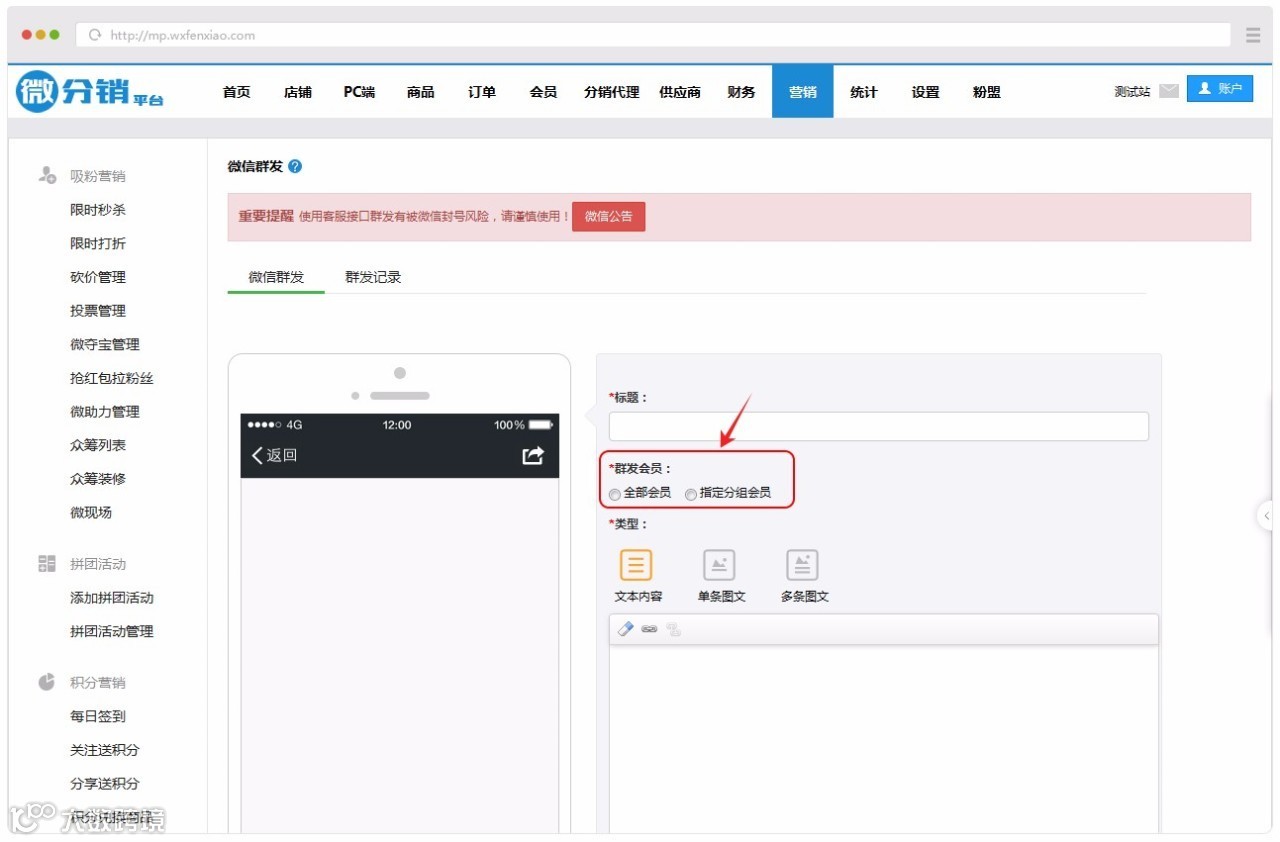 后台营销模块中微信群发可以设置指定分组分送消息。