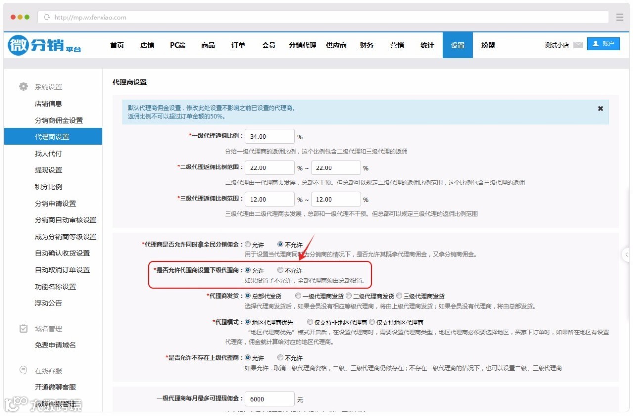 后台设置模块中代理商设置添加是否允许代理商设置下级。
