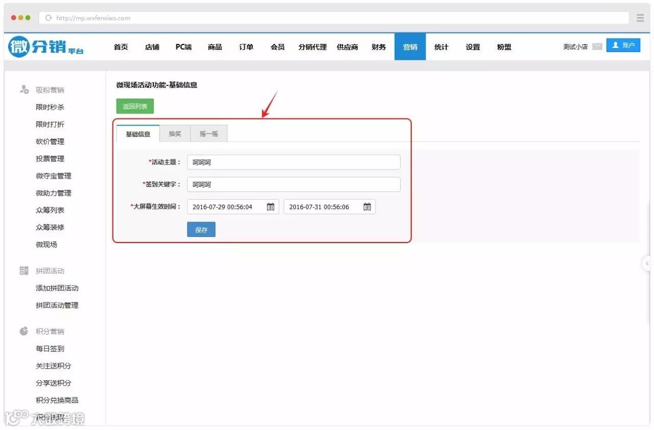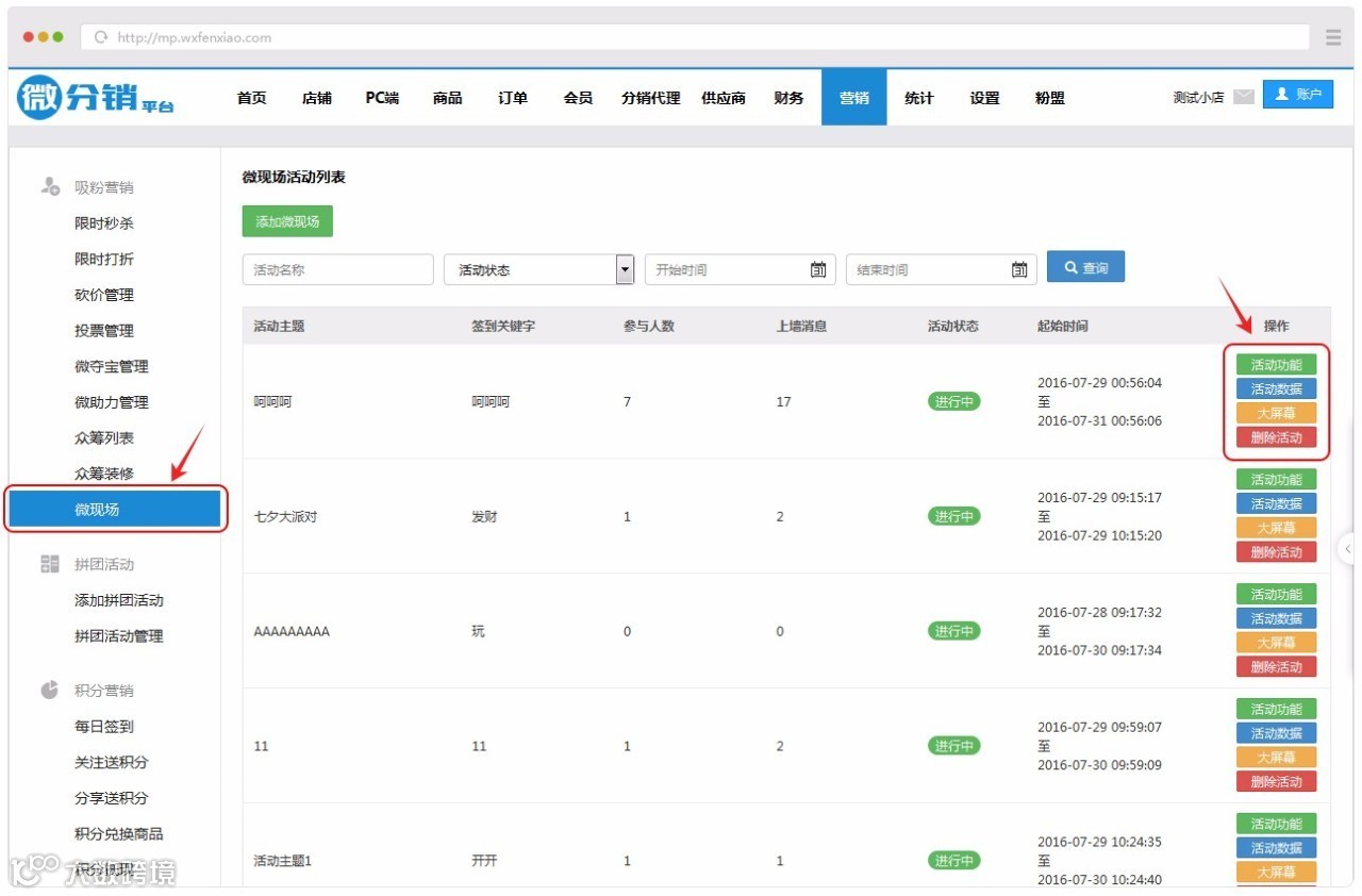 营销活动中新增微现场功能,目前微现场包括消息互动、签到、抽奖和摇一摇活动,方便商家做现场活动时使用。