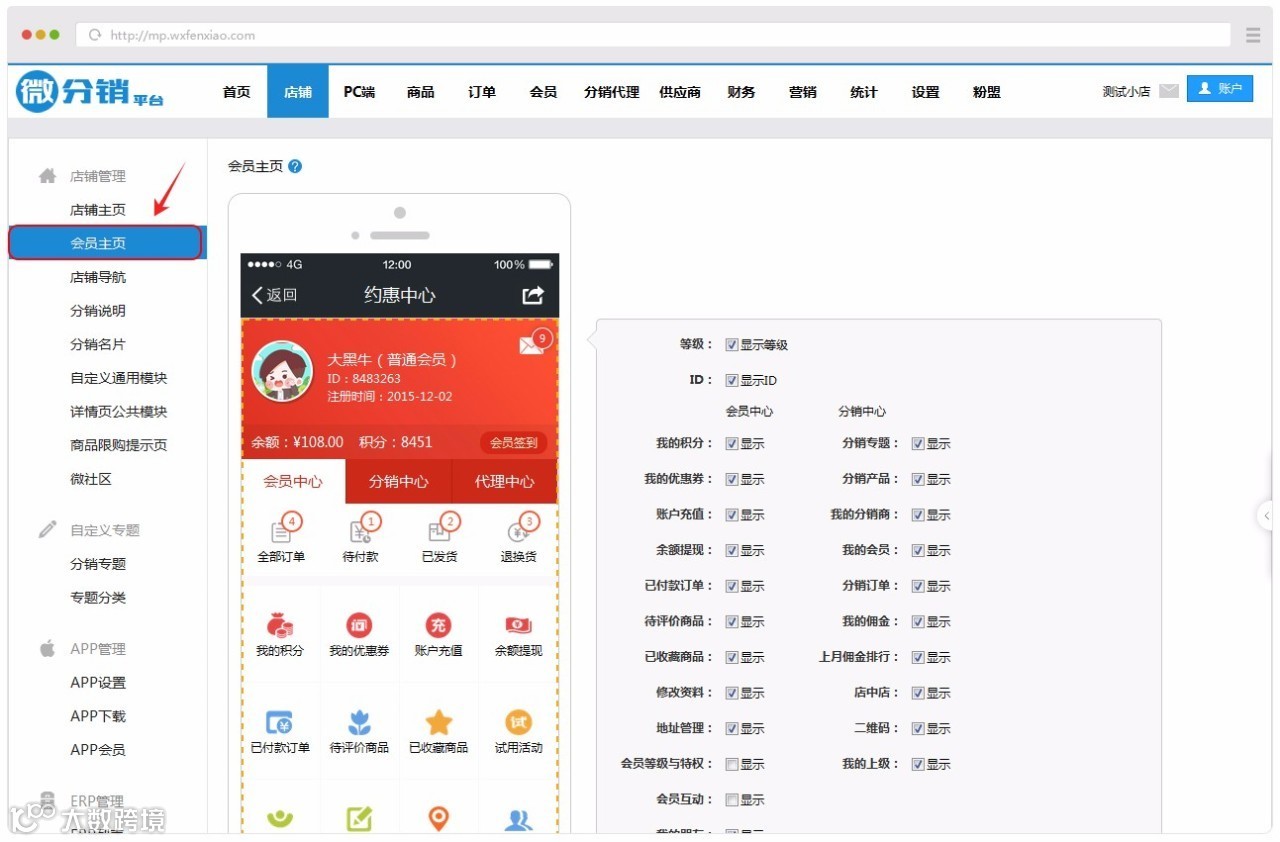 后台店铺模块中会员主页添加会员中心的一套新模板,点击更换模板可以进行选择。