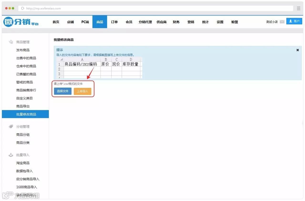 后台商品模块中新增菜单“批量修改商品”,可以通过导入*.csv文件批量修改商品的价格和库存,必须按照下图中的编辑可是和标题填写的内容。