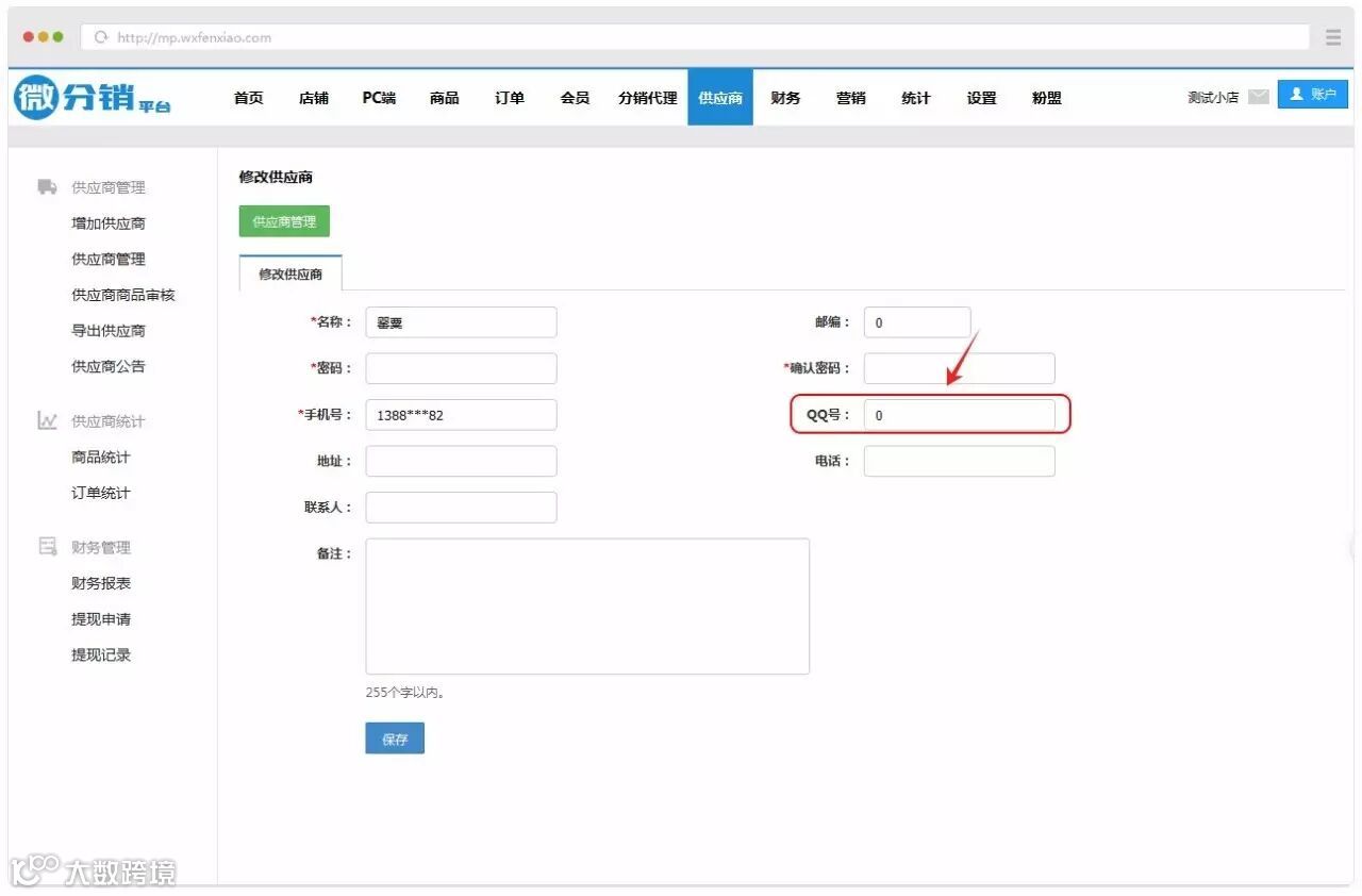 商家后台编辑供应商信息时,可以设置供应商QQ号,设置了QQ的供应商上传的商品,在手机端商品详情页中可以直接QQ点开联系对应的供应商。