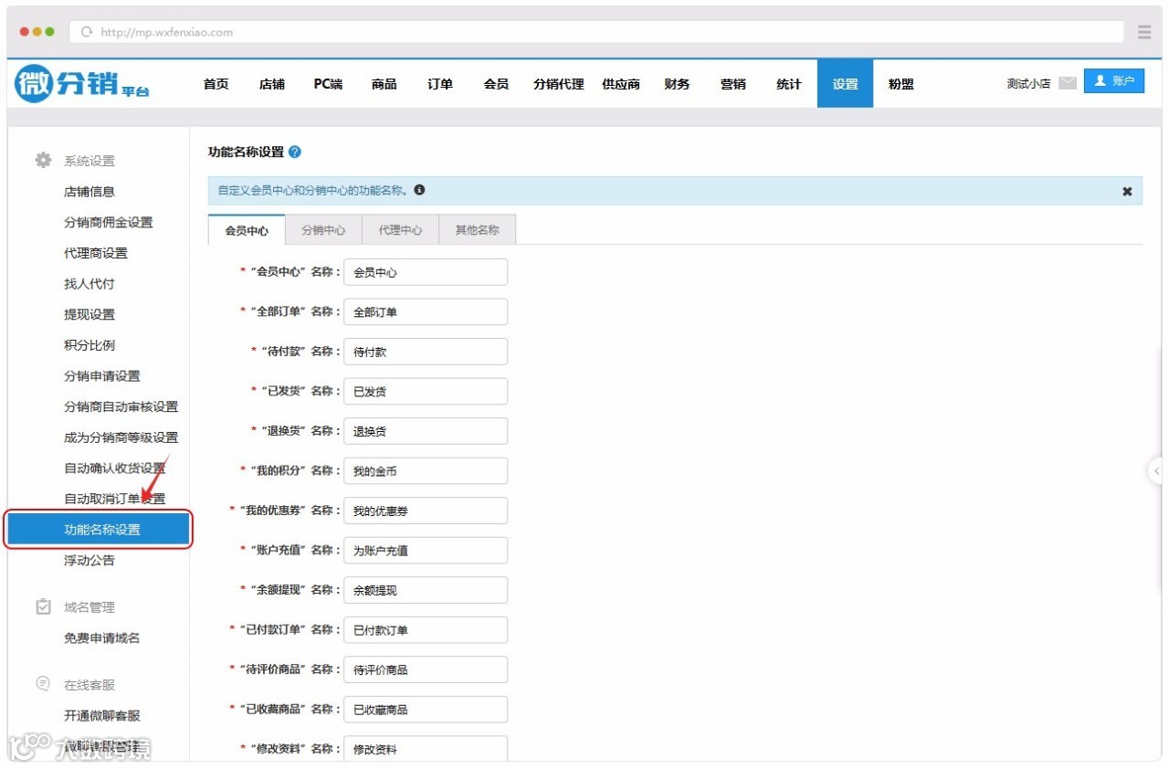 6、功能名称设置中里可以对“会员签到”、“分销商提成”、“代理商提成”进行修改