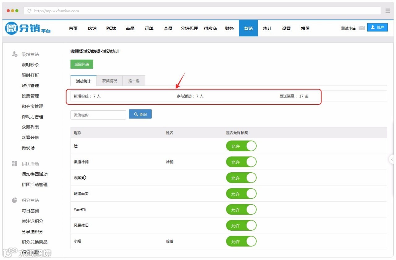 点击活动统计可以查看签到人数,获奖情况和摇一摇中每个人摇了多少次。