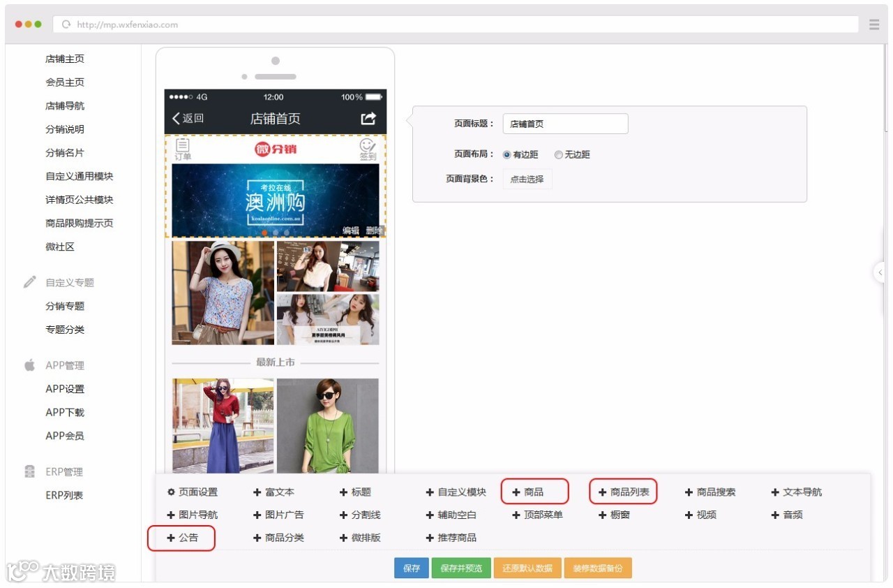 编辑店铺,装修组件“商品”和“商品列表”新增“滑动商品”的布局方式,公告模块的字体和背景颜色都可以进行修改。
