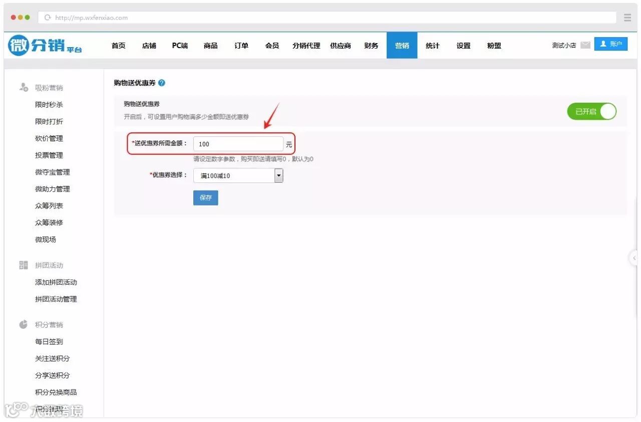 7、“购物送优惠券”可以设置满多少金额才送优惠券
