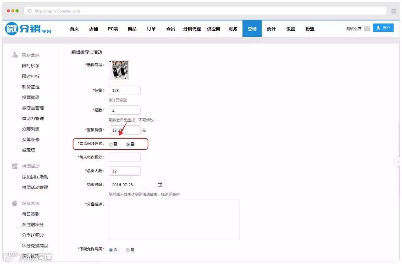 营销模块中吸粉营销中的微夺宝管理,添加夺宝活动可以设置为积分夺宝。