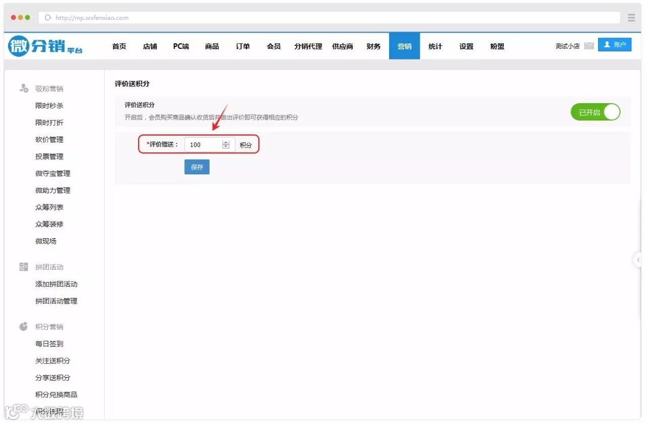 后台营销模块中的积分营销中添加评价送积分,点击可进行设置评价一次送多少积分。