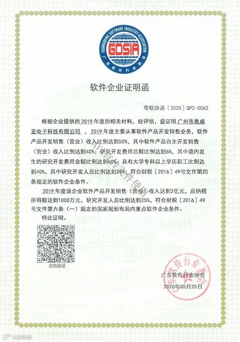 市奥威亚电子科技有限公司(以下简称:奥威亚)被认定为2019年度“国家规划布局内重点软件企业”,这也是奥威亚连续4年荣获该项