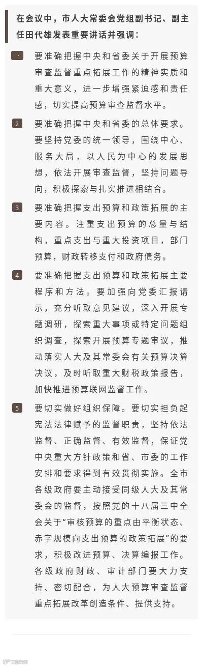 本次会议传达了全省人大预算审查监督重点拓展改革推进会精神,学习了中央、全国人大常委会和省委关于人大预算审查监督重点向支出预算和政策拓展的相关文件精神,交流了各县区人大常委会预算审查监督方面的好经验好做法。