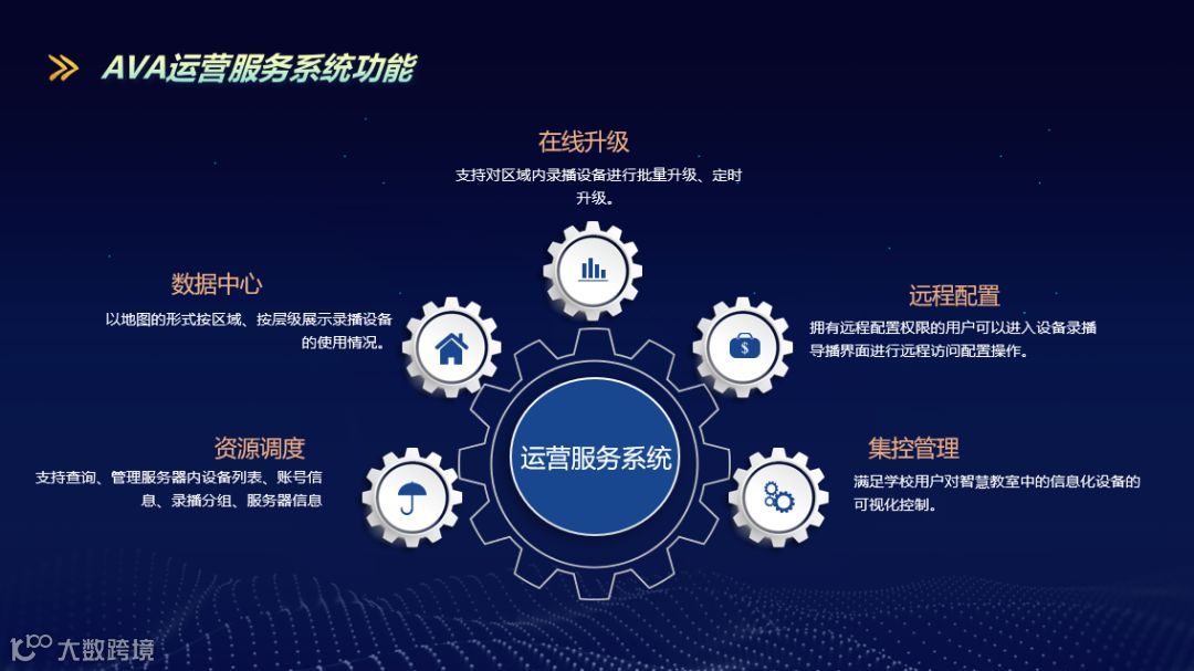 奥威亚运营服务系统以“区域直播、互动资源调控”为核心,能同步实现“录播数据中心”、“录播远程运维”、“录播集控中心”等作用,极大地提高区域录播资源整合能力,最大限度地保持设备的常态化运行,为各区域的教学工作灵活开展,提供了更坚实的保障。