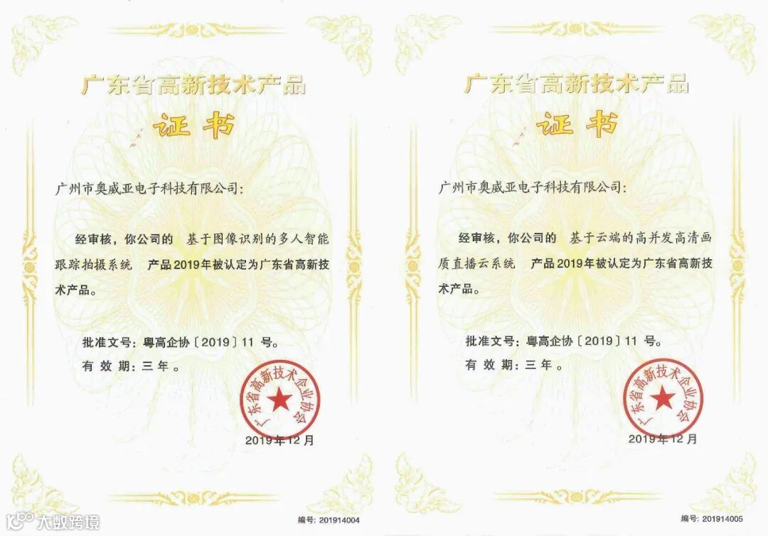 去年,奥威亚“基于图像识别的多人智能跟踪拍摄系统”和“基于云端的高并发高清画质直播云系统”产品,又被认定为广东省高新技术产品。