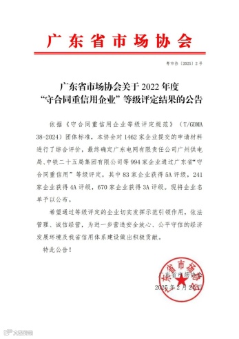 图:广东省市场协会关于2022年度“守合同重信用企业”等级评定结果公告