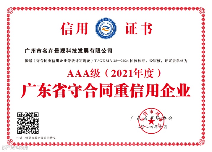 近日,广东省市场协会发布关于2021年度“守合同重信用企业”等级评定结果的公告。依据《守合同重信用企业等级评定规范》(T/GDMA 38-2024)团体标准,名卉公司获评2022年度“守合同重信用企业”AAA等级。