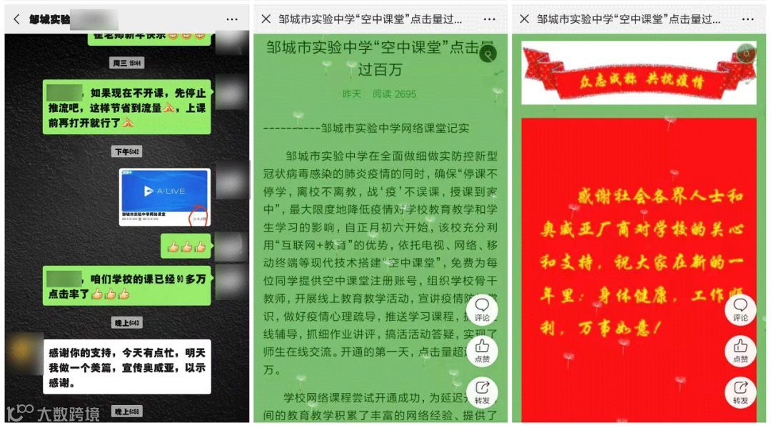 1月30日起,山东省邹城市实验中学高三毕业班通过奥威亚 “名师直播支持服务”开展了备考辅导网络直播活动。各科名师按课表轮流开课,课程面向全市高中开放,截至2月2日20时,邹城市实验中学总计直播课数27节,观课人次157万,奥威亚为疫情特殊时期教育教学工作提供的有力支持,受到了校方的认可与感谢。