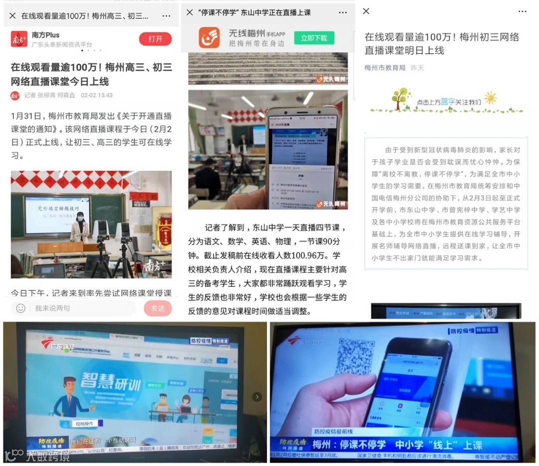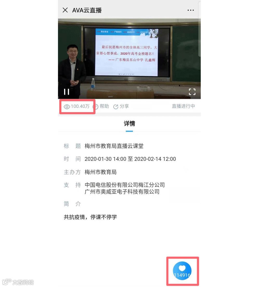 2月2日,为满足高三学生的备考需要,广东梅州市教育局组织开展“名师备考辅导网络直播活动”,通过奥威亚的录播设备及“名师直播支持服务”,向全市高三学生直播。一天内,东山中学共直播四节课,涵盖语文、数学、英语、物理。上午2节直播课结束之前,短短4小时内观课人次就已突破100万,观众点赞达11万。