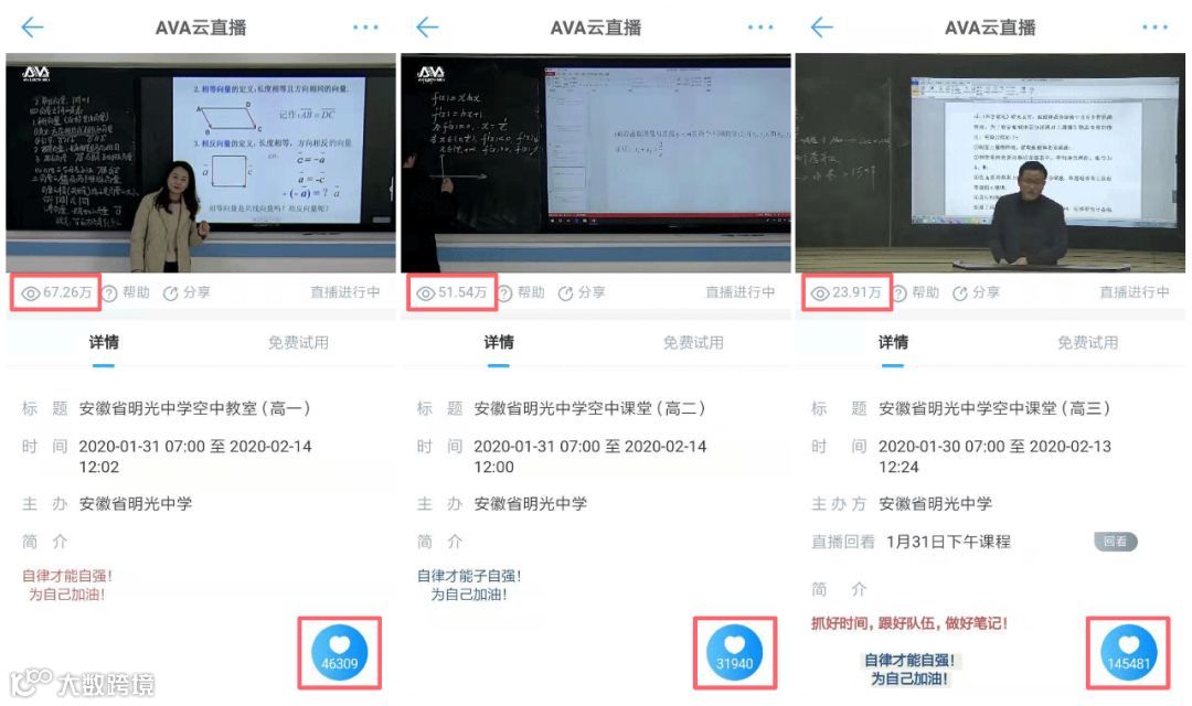 1月29日,为确保 “停课不停学、学习不延期”,安徽明光中学通过学校建设的3间奥威亚录播课室及奥威亚免费提供“名师直播支持服务”为高中重要课程开展备考辅导网络直播。截至2月2日20时,累计观看量达264万人次,校方对奥威亚的公益之举高度赞赏。