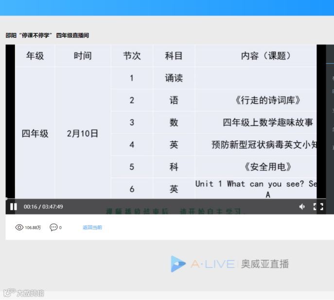 邵阳市洞口县教育局利用奥威亚部署平台汇聚优质教学资源组织一年级到高三学生,开展多种形式的教学活动。坚持国家课程学习与疫情防控知识学习相结合,特别注重疫情防护知识普及,加强生命教育、公共安全教育和心理健康教育,添加唱国歌等爱国情怀教育。自2月6日-27日,共21天,奥威亚助力邵阳地区开展180场直播,受益学生超过15万人,2月26日,单日直播流量突破500万人次。
