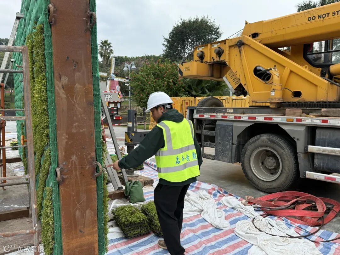 作为工程管理部副经理、第二分公司负责人,陈家庆始终冲锋在全运项目工作前沿。他主要负责广东奥体中心、海心桥及全运会吉祥物等立体景观。连日来,他深入各重点项目现场,对公司在建在养项目开展全方位巡查,从立体花坛结构稳定性到植物生长状态,从施工规范执行到现场安全管理,不放过每一个细节,确保各项工程安全有序推进。假日期间,他也主动投身应急巡查工作,以“时时放心不下”的责任感,确保全运会期间项目安全无事故。