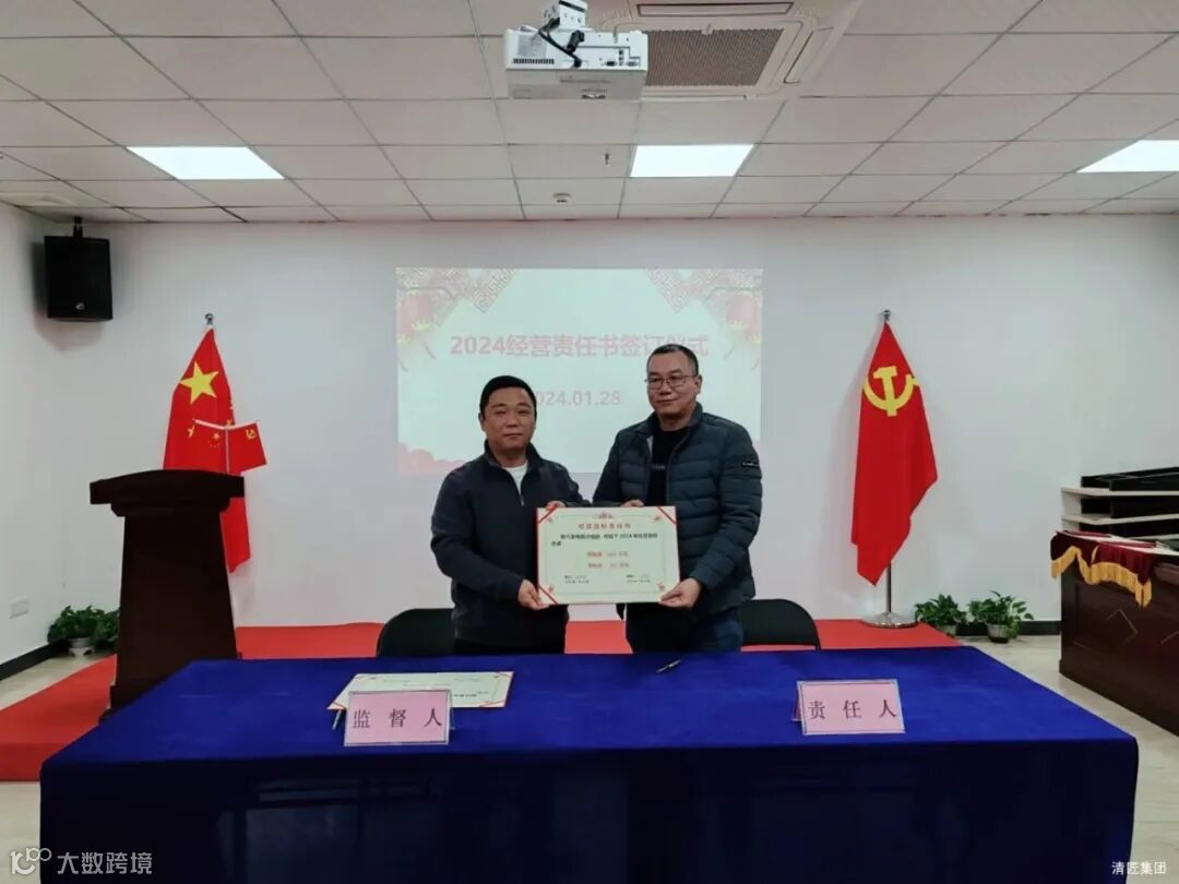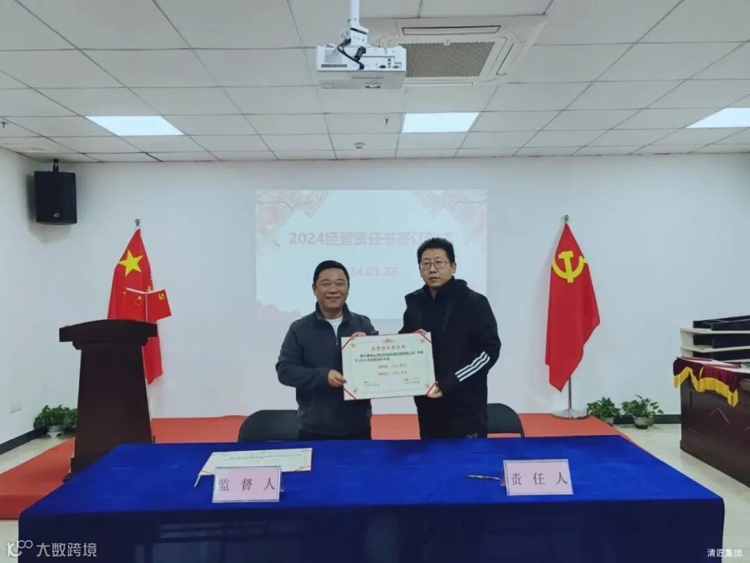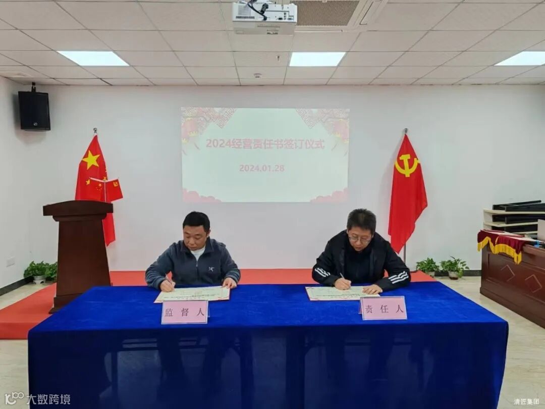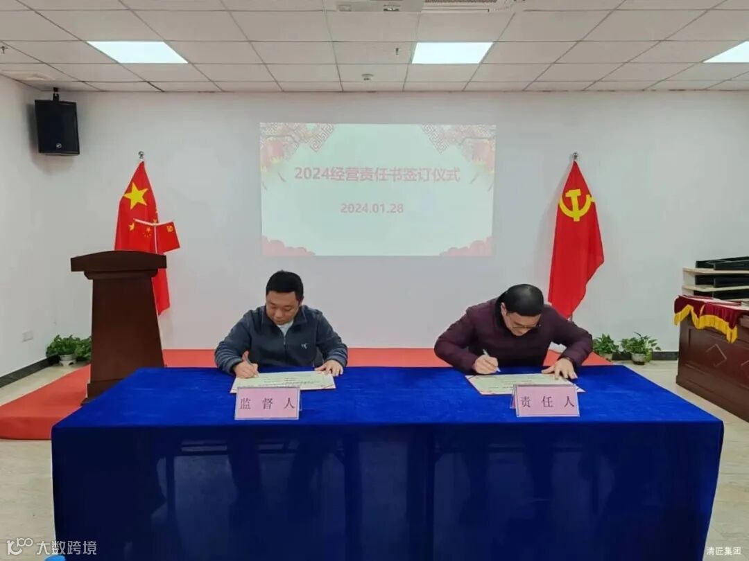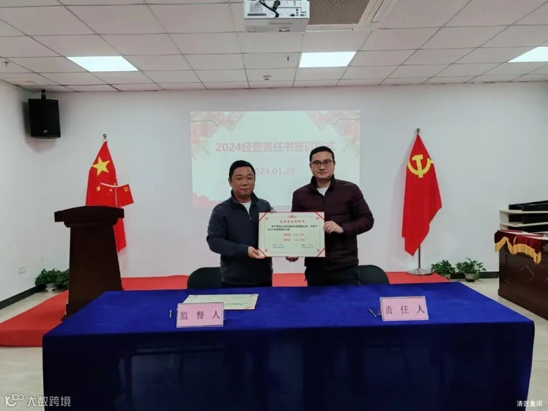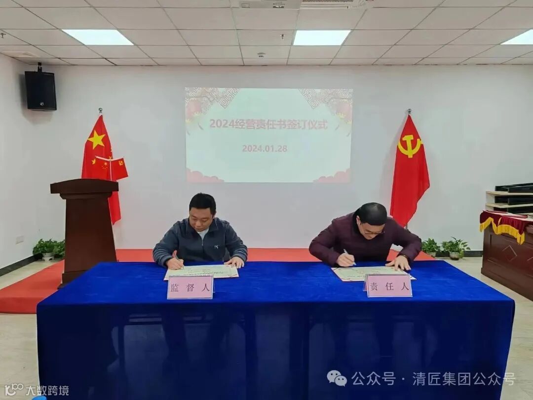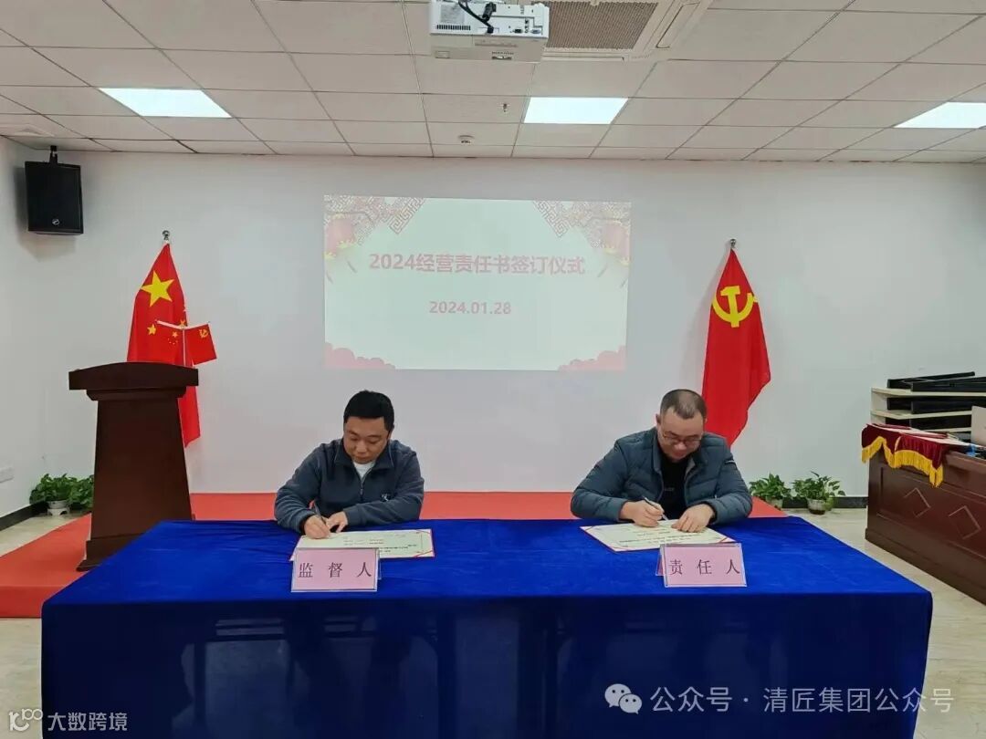 2024年1月28日上午,清匠集团召开子公司&集团职能部门年度述职。述职会后子公司总经理向集团李总、总裁江总签订24年度经营目标责任书。