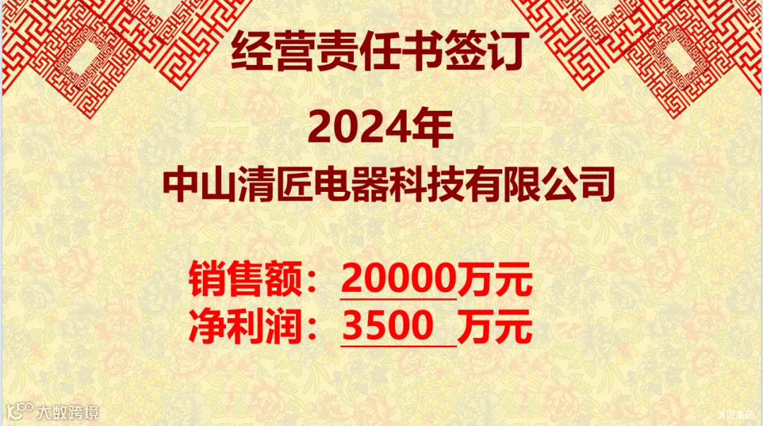 集团总裁江总与清匠电器科技公司总经理郭总签订24年经营目标责任书。