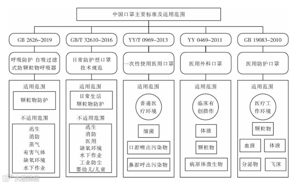 不同类型的口罩遵循不同的标准,不同口罩适用范围各不相同。中国口罩的几个主要标准为GB2626-2019呼吸防护自吸过滤式防颗粒物呼吸器、GB/T32610-2016日常防护型口罩技术规范、YY/T0969-2013一次性使用医用口罩、YY0469-2011医用外科口罩、GB19083-2010医用防护口罩技术要求,以下详细介绍各主要标准。