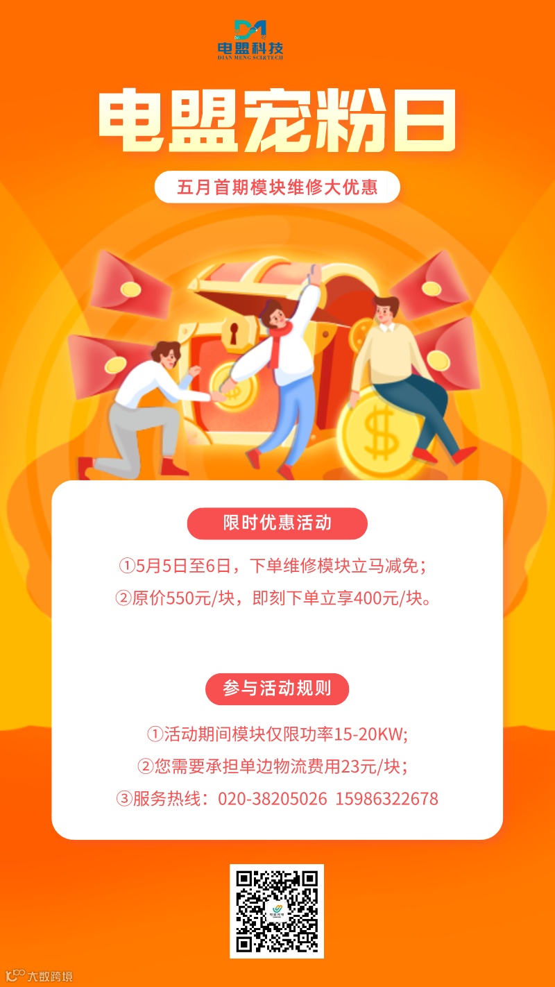 导读:为回馈大家的支持,降低疫情的影响,“电盟小二”5.5--5.6日进行模块维修限时减免活动,欢迎各位萌粉前来致电!