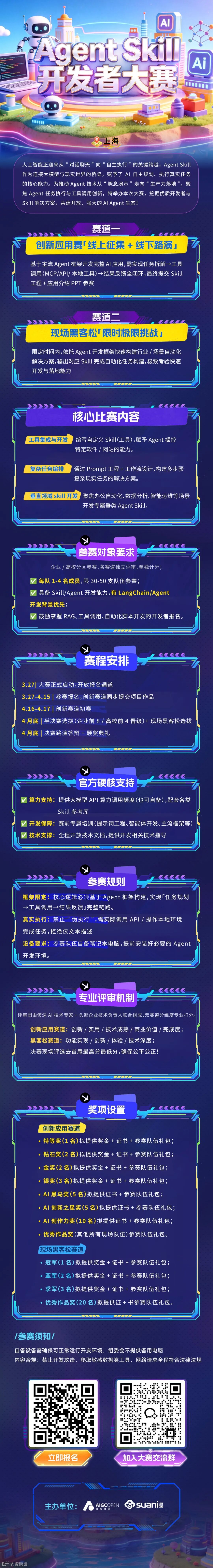 为推动AI技术从概念演示迈向生产力落地,Agent Skill开发者大赛正式启动!大赛由AIGC开放社区与算泥社区联合主办,旨在挖掘实战型开发者,共建开放强健的AI Agent生态。