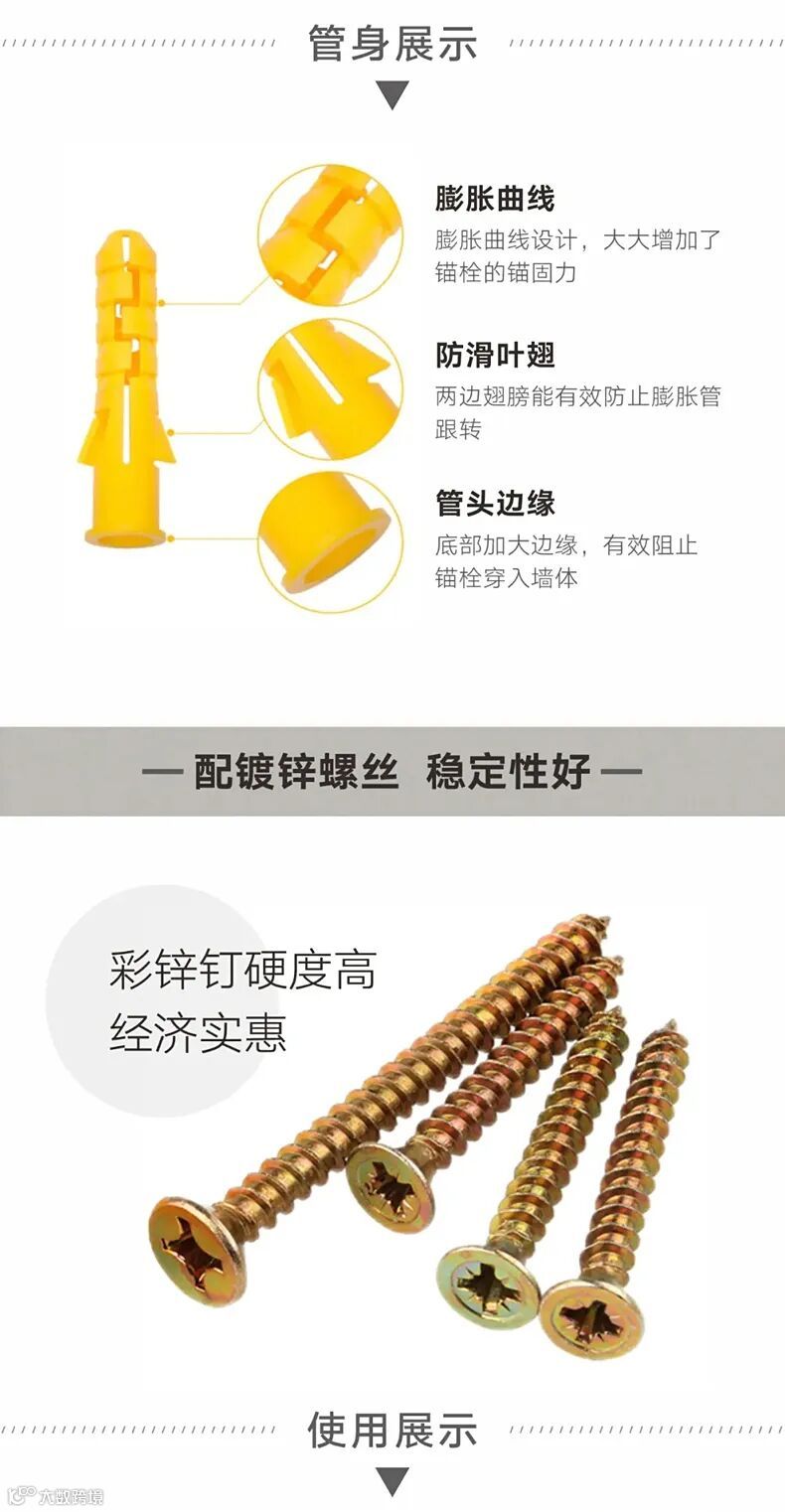 在预先打好孔的墙体中置入膨胀管,被连接的物品穿过螺钉后拧入管体中,在螺钉被拧紧的过程中,膨胀管体会迫于压力向外胀开,与墙体形成更大的接触面,从而起到紧固的作用。