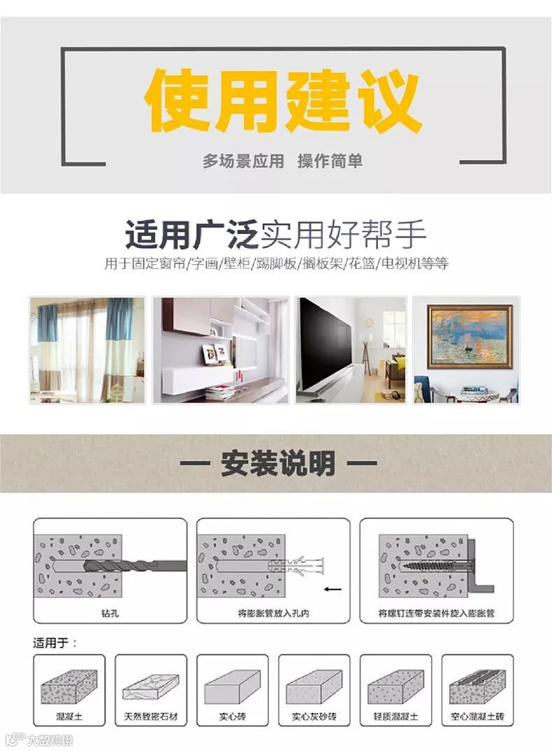 在进行安装之前,应了解安装物品的重量、安装基材的硬度,再来选购一款合适的膨胀螺栓。