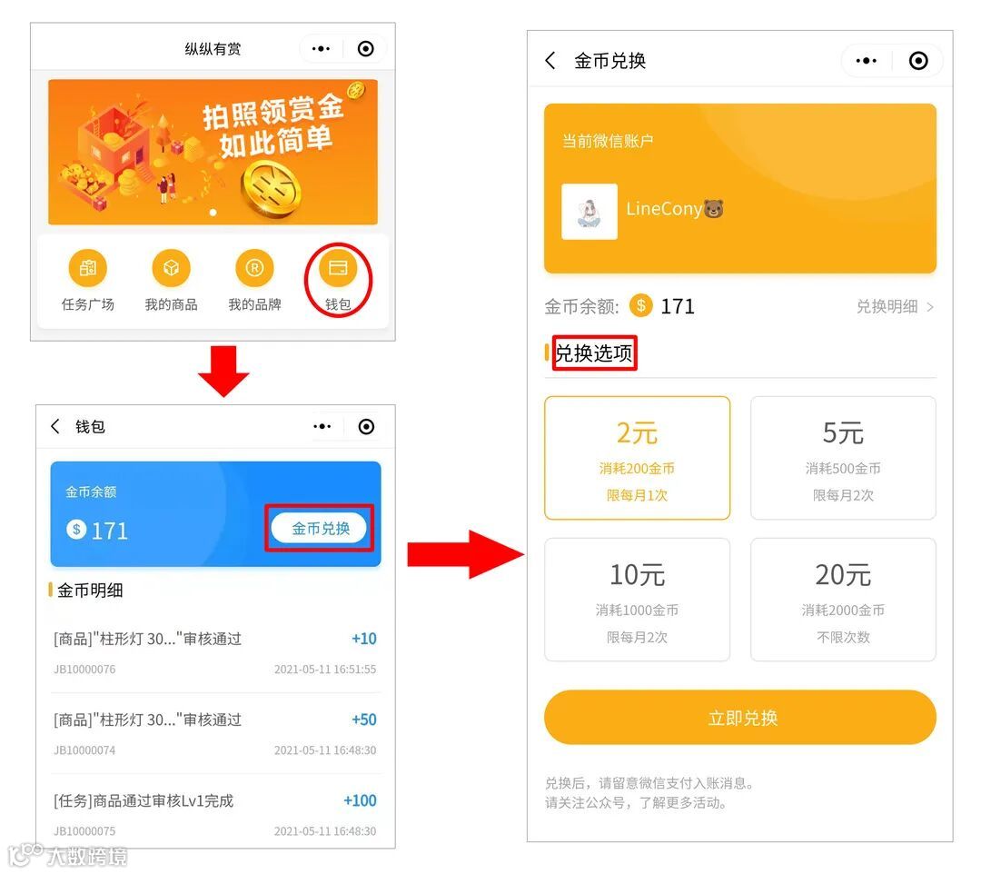 点击小程序首页【钱包】即可查看账户金币余额与明细记录,点击【金币兑换】按钮进入金币兑换提交页面,可按当前金币余额进行相应兑换。