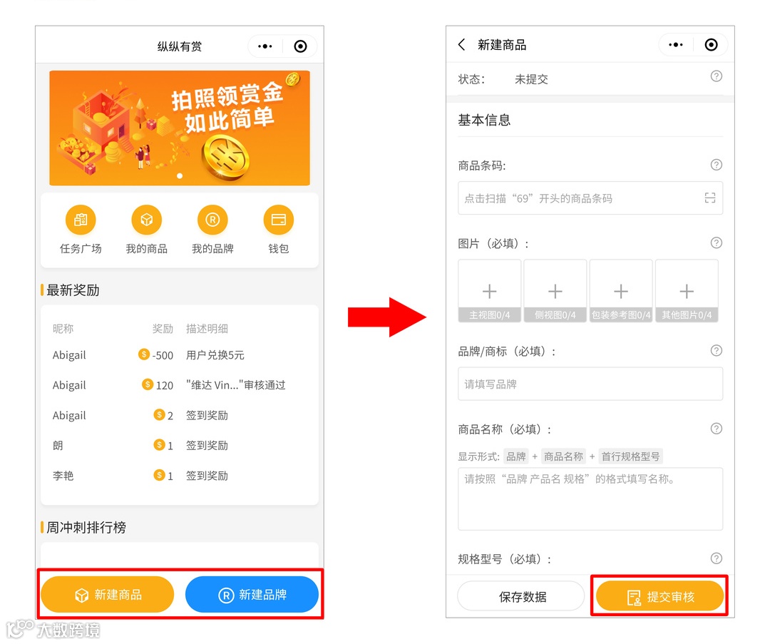 在首页最下方,点击【新建商品】或【新建品牌】即可拍照上传提交审核,在审核通过后系统将自动发放相应奖励金币。