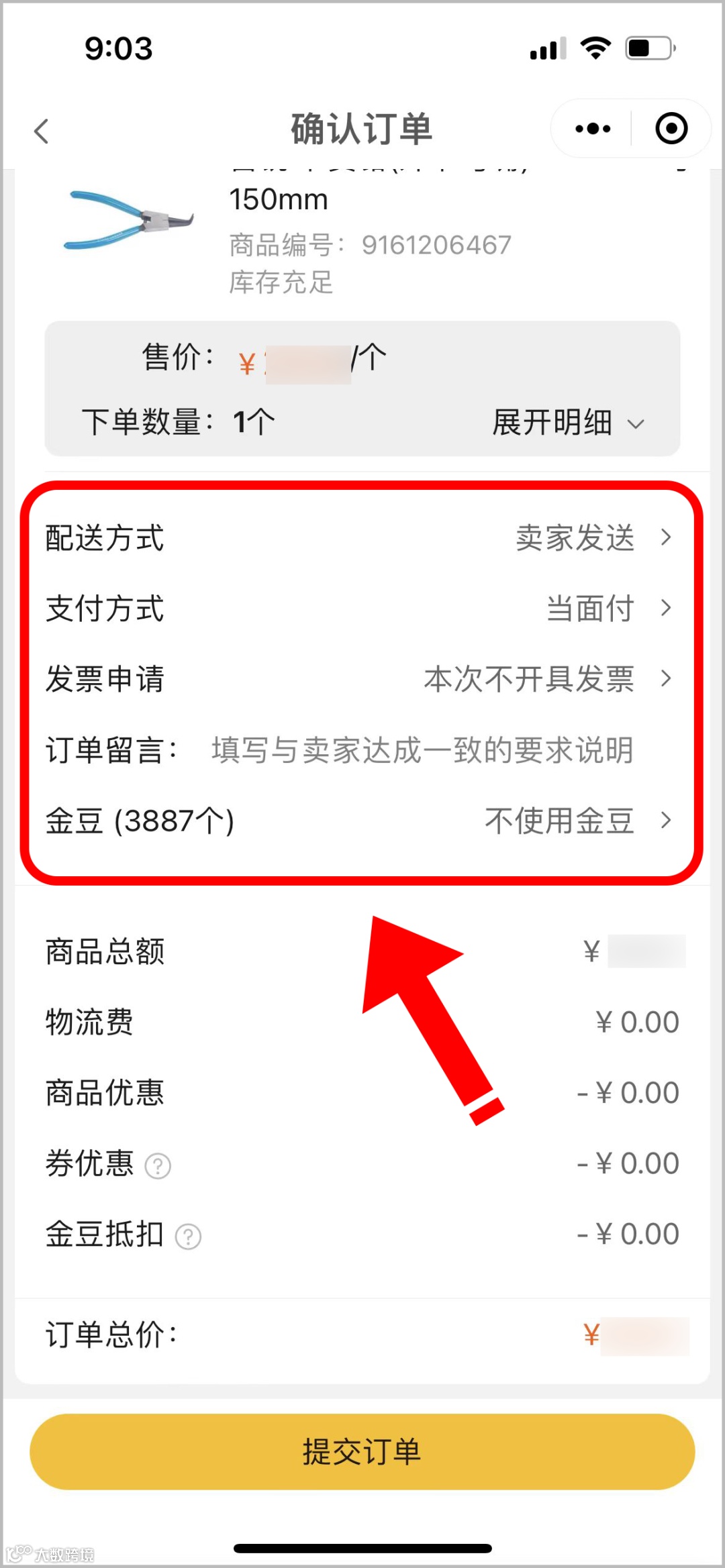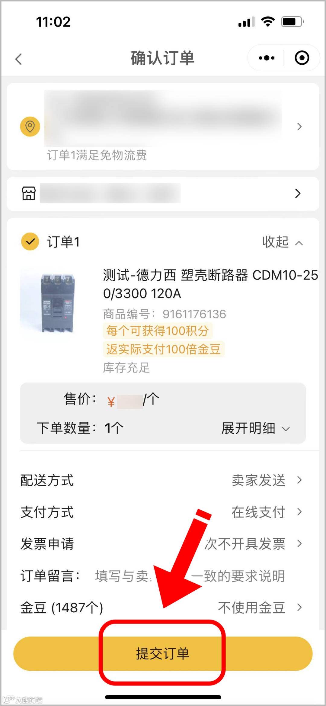5.在确认订单页面,可根据自身情况点击选择【配送方式】、【支付方式】、【发票申请】、【订单留言】以及根据商品能否满足用金豆条件,选择是否使用金豆抵扣金额结算;