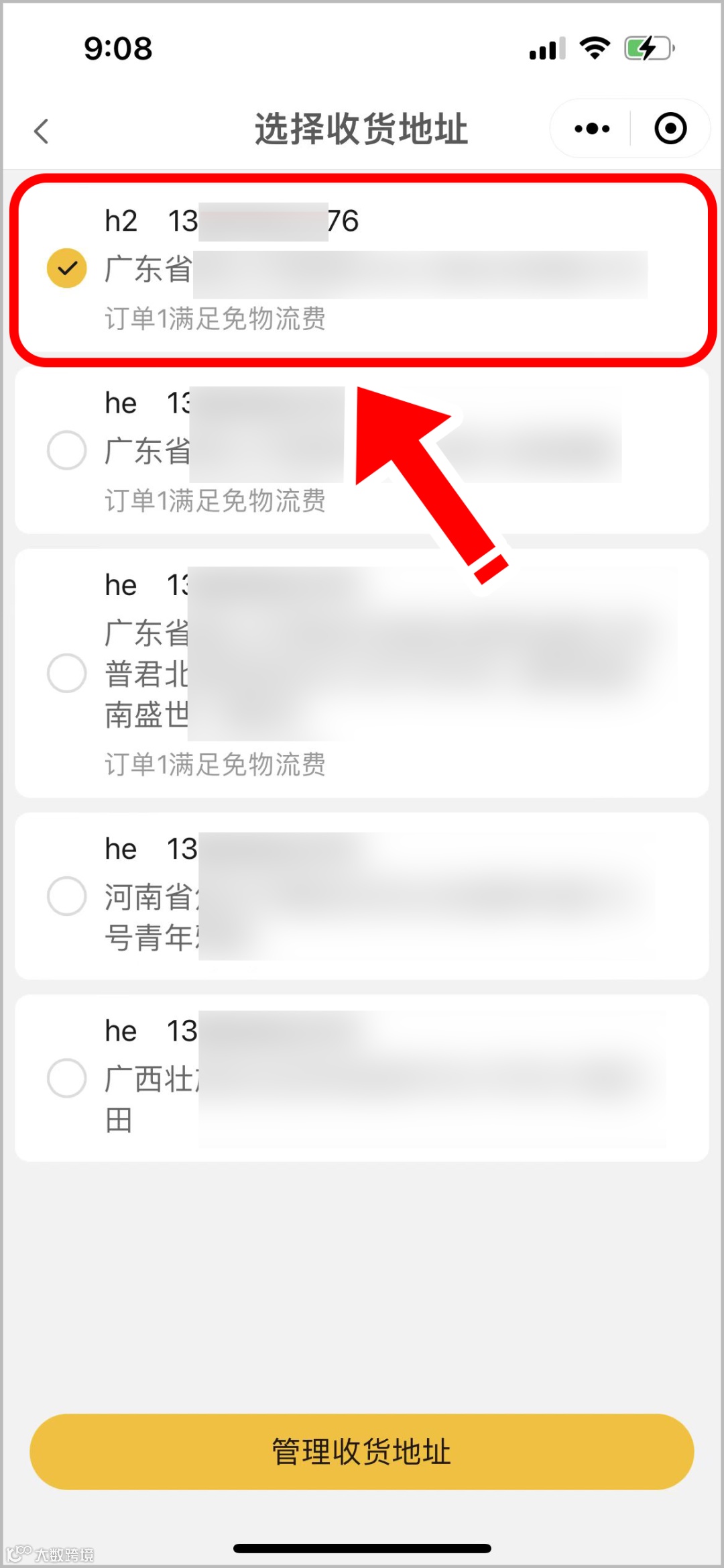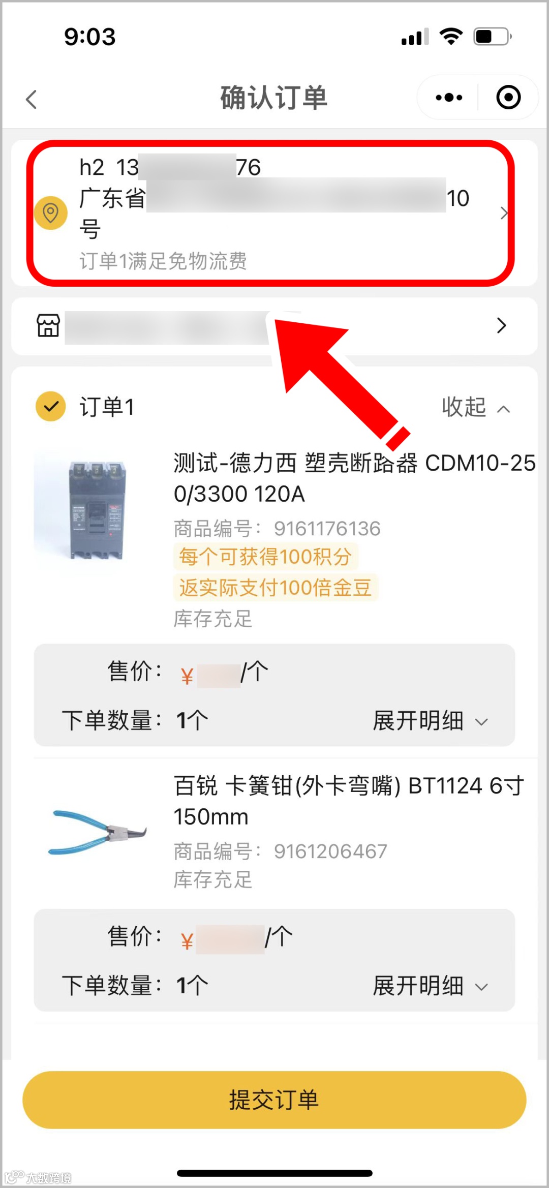 4.勾选地址后,将自动返回确认订单页面,显示更换后的地址即修改成功;