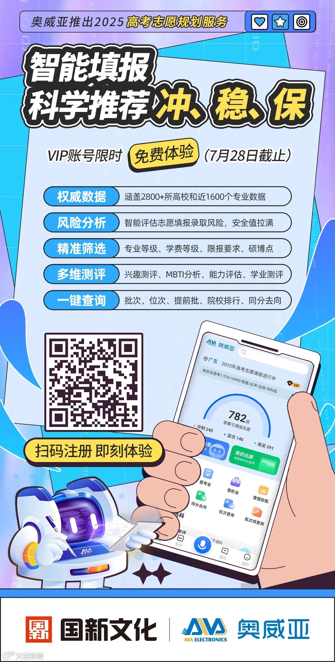 【手机端用户】:识别二维码,注册账号即可免费获得VIP账号限时体验权限,一键生成专属志愿方案!
