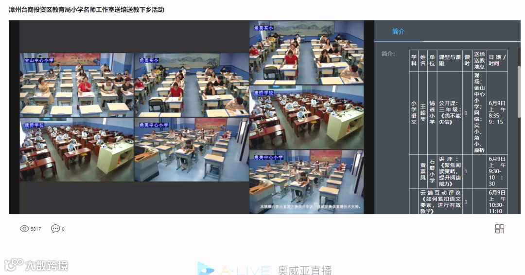 通过远程互动教研,全区老师们在交流研讨中收获教学新理念,促进自身专业成长。该区教育局邀请名师工作室的名师,分别以金山中心小学、东美中心小学、角美中心小学为主会场,角美实验小学、第二中心小学、康桥学校等为分会场,开展为期3天的1V3互动教研活动。活动全程通过奥威亚云直播平台进行直播,吸引了全区各校老师在线观看。收看直播的老师,通过云端互动评议,在思想的碰撞中吸取先进教学智慧,为教学创新积累了宝贵的经验。