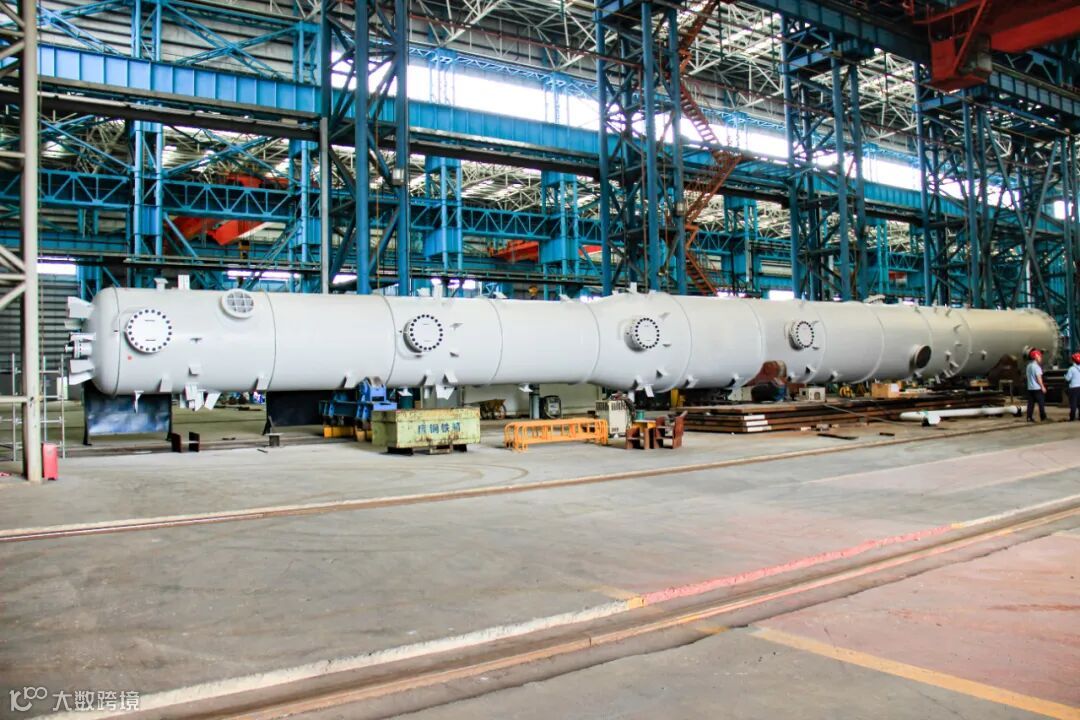 此次交付的设备包含正构稳定塔、加氢稳定塔和精制塔,共3台塔器,总重约227吨,主要用于化合反应产生物料或物料精馏吸收萃取。其中,精制塔主要采用不锈钢复合板材料所制,内部预焊件多,工艺流程复杂;而另一台设备——正构稳定塔,除了同样内部预焊件多之外,尺寸长达40米,重约95吨,存在着总装缝组焊困难等作业难点。
