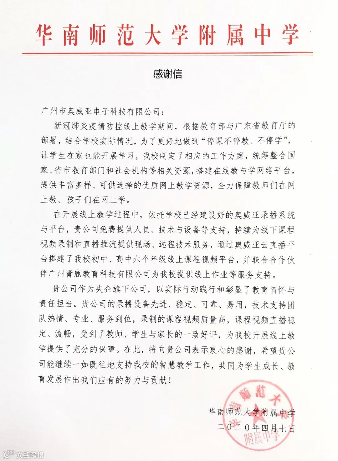 4月8日,奥威亚收到了一封来自华南师范大学附属中学(以下简称:华师大附中)暖心的感谢信,信中写道:贵公司(奥威亚)的录播设备先进、稳定、可靠、易用,技术支持团队热情、专业、服务到位,录制的课程视频质量高,课程视频直播稳定、流畅,受到了教师、学生与家长的一致好评,为我校(华师大附中)开展线上教学提供了充分的保障。