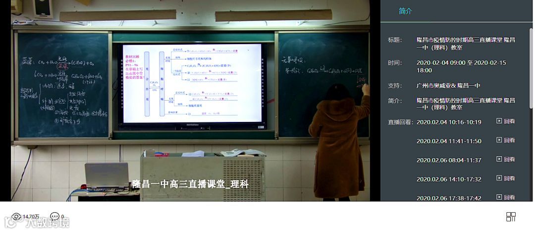 2月1日开始,隆昌市教体局在奥威亚录播教室支撑下,开展全市高三文理科和初三在线课程教学,目前已覆盖全市多所学校,受益学生超8000多人,开通在线课程800多节,截至3月1日,直播点击量超3000多万人次,最高观看人数达到1万多人。