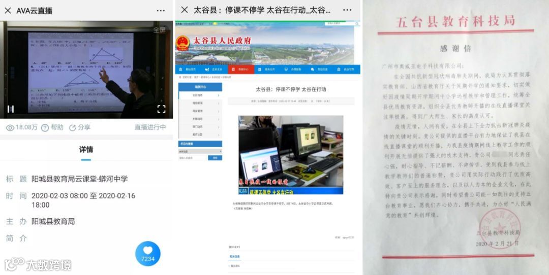 2月14日,通过奥威亚“微课轻松录”软件及“名师直播支持服务”,晋中市太谷区与忻州市五台县同期开展名师直播,面向全县中小学开放。此外,晋中市太谷区名师资源还辐射周边,榆次区、灵石县、左权县等各区县师生纷纷受惠,日均直播观看人次高达700万。良好的效果获得太谷区人民政府、太谷区教科局的特别关注与报道。截至2月26日,忻州市五台县直播观看量累计突破千万人次,县教科局对奥威亚强大的技术支持表示高度赞许,老师们也一致称赞。