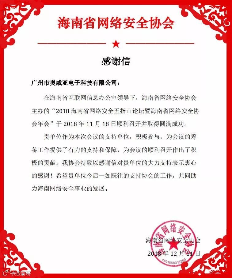 一直以来,奥威亚秉承着“贴近客户,深入难点”的服务宗旨,而及时为客户提供技术支持正是奥威亚服务宗旨驱动的结果。近日,海南省网络安全协会向奥威亚发来感谢信(详见下图)。这不仅是对奥威亚优质服务的褒奖,更是一种鞭策和激励。