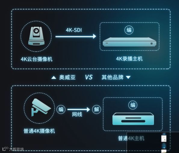 奥威亚作为国内视频互动与智慧教学方案的主要提供商,2018年,凭借其超强的研发实力和创新能力,研发团队独创4K-SDI传输技术,4K摄像机无需编码,即可把4K超高清画质传给4K录播主机,主机收到数据后进行编码。一次编码可以避免常规4K方案(网线传输)两次编码带来的画质二次损失,实现近乎无损的效果,奥威亚用4K技术,满足教学视频更高画质的需求。