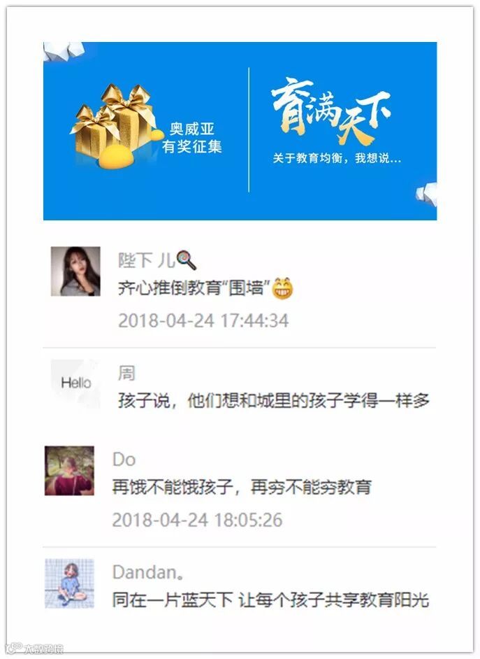 1999年,一部电影《一个都不能少》赚足了大众的眼泪,其反射的中国乡村教育问题时至今日依然值得我们深思。2018年,奥威亚始终致力于让每个孩子都能享有公平而有质量的教育资源,并在4月24日-5月2日,通过线上征集教育均衡感言,得到众多教育工作者的积极响应。