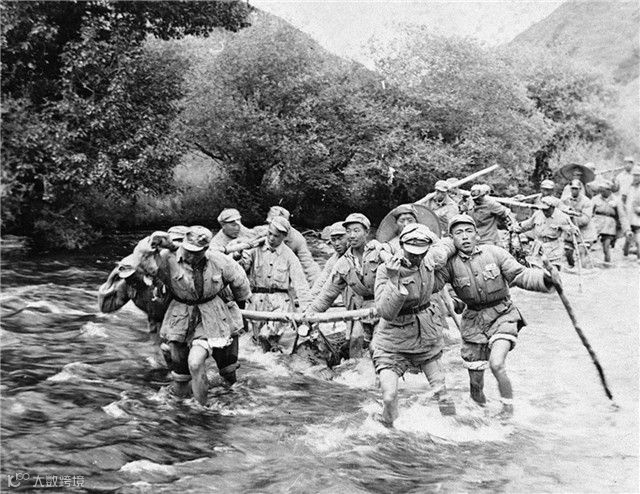 1950年,筑路大军挺进西藏途中,官兵们在冰冷刺骨的河水中抬运石料 (资料照片)。新华社发