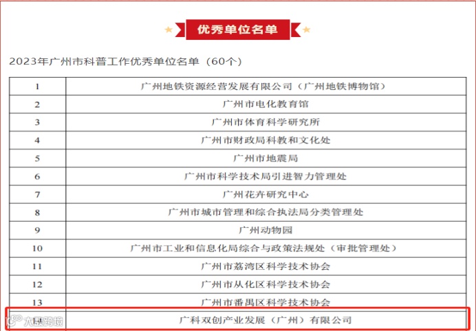 近日,广州市科协公布了“2023年广州市科普工作优秀单位、优秀科普工作者和优秀科技志愿者学习宣传活动遴选结果”,广科双创产业发展(广州)有限公司入选科普工作优秀单位。